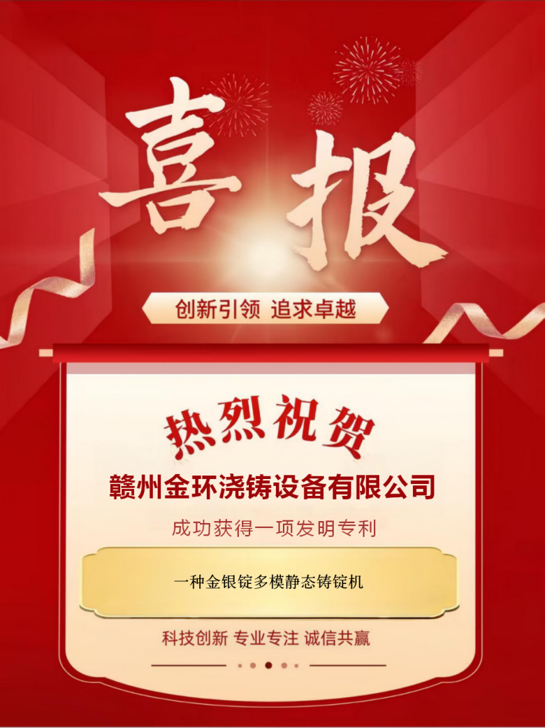 春启新程,捷报频传!正值马年春节刚过、全员凝心聚力启新篇之际,赣州金环再传喜讯,一项自主研发成果:一种金银锭多模静态铸锭机顺利通过国家知识产权局审核,成功授予发明专利。为新一年的创新发展再添浓墨重彩的一笔,彰显了公司开局即冲刺、奋进正当时的昂扬姿态。此项发明专利的成功授权,是公司深耕核心技术、坚持创新驱动的又一重要成果,凝聚着项目团队的匠心钻研与不懈付出,更是公司自主创新能力持续提升的生动体现。专